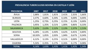 Cabe recordar que la provincia sigue encabezando, según los datos ministeriales de finales de 2021, el censo de ganado vacuno en España, con 594.420 reses; motivo por el cuál se encuentre la tuberculosis con mayor incidencia en Salamanca. Dentro de la provincia charra, la prevalencia se ha concentrado, fundamentalmente, en la Unidad Veterinaria de Vitigudino (5’04 %) y sus colindantes, como son La Fuente de San Esteban (3’55 %) y Ledesma (3’06 %). Preocupante es la zona de Béjar (5’25%) donde han repuntado los casos, superando a Vitigudino.