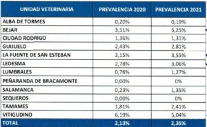 La media regional se sitúa en el 1’34 % y la mayor concentración de la enfermedad se circunscribe a Béjar, Vitigudino, La Fuente de San Esteban y Ledesma