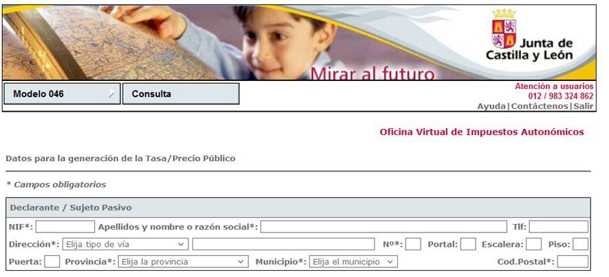 - Entra en el siguiente enlace: https://servicios4.jcyl.es/sirijcyl/usuario/FormWeb046?pageOperation=ALTA_TASA046&ACCESO=ACCESO_SIN_CERTIFICADO&FUNCIONALIDAD=TASAS&grupoFuncionalidad=16