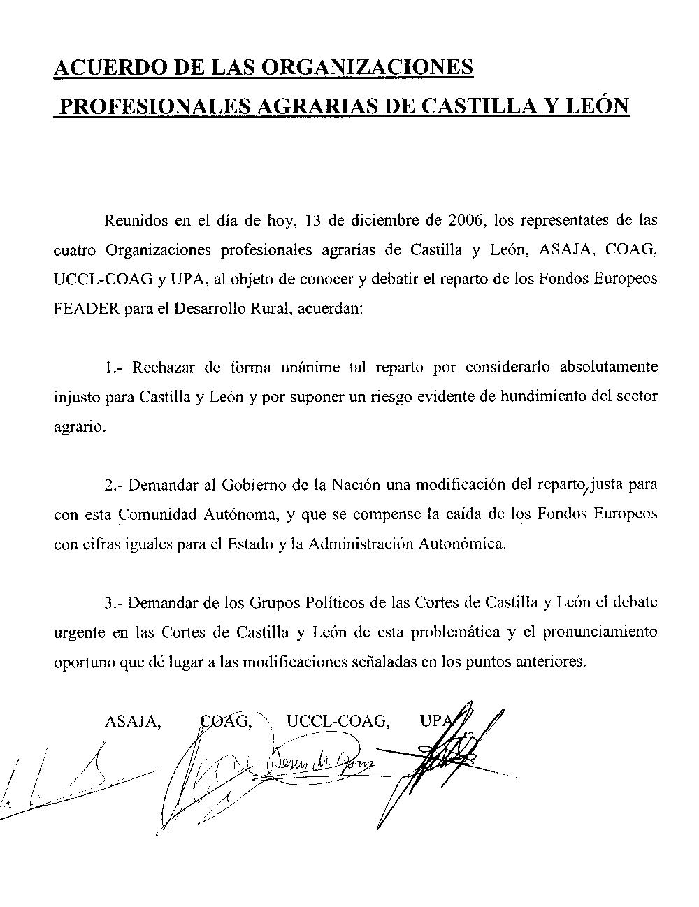 Las organizaciones profesionales agrarias ASAJA, UCCL-COAG, Coordinadora Agraria- COAG y UPA, reunidas el martes día 13 de diciembre, después de conocer y debatir el reparto de Fondos Europeos FEADER para el Desarrollo Rural, firmaron un documento conjunto que aquí reproducimos.