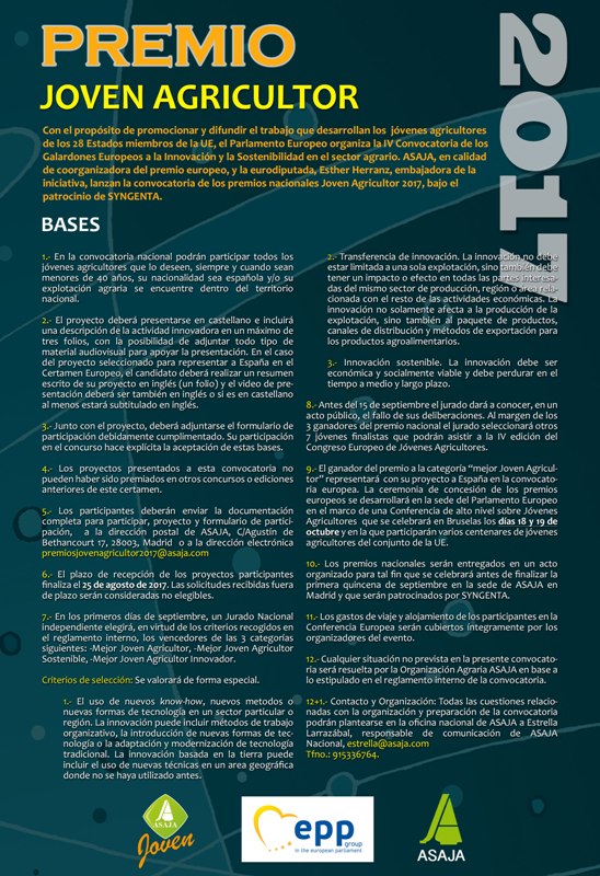 El formulario de participación y las bases del certamen pueden descargarse de la web de ASAJA www.asaja.com y la documentación completa para participar (formulario de participación, proyecto y anexos) deberá enviarse antes del 25 de agosto a la dirección electrónica premiosjovenagricultor2017@asaja.com