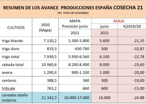 La Sectorial de Cereales de ASAJA reunida hoy en Madrid ha cifrado la cosecha de nacional cereales de este año en 16 millones de toneladas. Esto supone un significativo descenso de producción respecto al año pasado, cuando se alcanzaron los 21,3 millones de toneladas, según datos oficiales del ministerio de Agricultura. En suma, un recorte productivo que ronda el 25 por ciento.