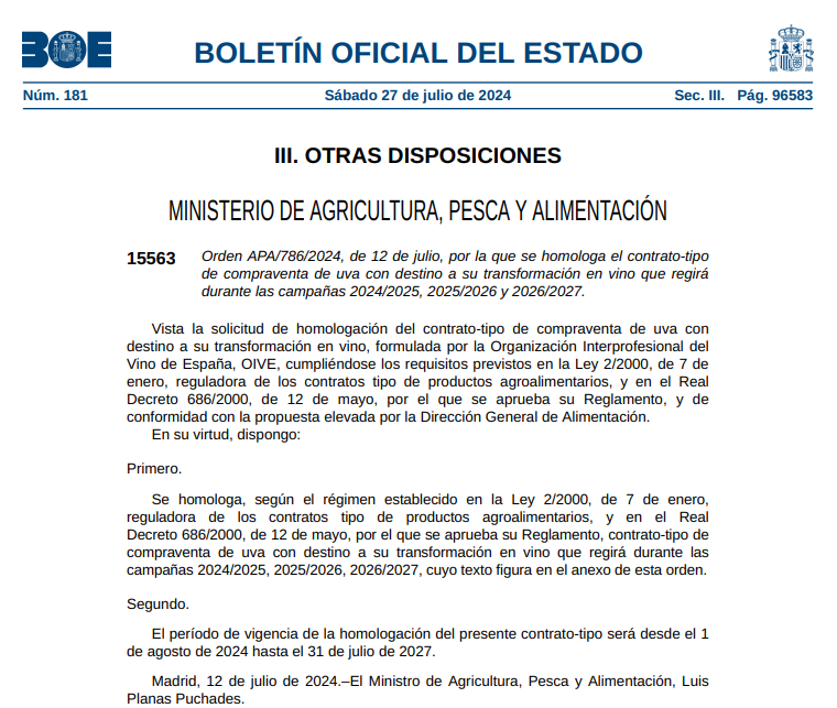 ASAJA de Castilla y León ha informado a los viticultores que ya está publicada la normativa que regula el contrato-tipo para compraventa de uva con destino a su transformación en vino, que regirá desde el próximo jueves 1 de agosto hasta el 31 de julio de 2027, es decir, tres campañas vitivinícolas. Este contrato-tipo es acordado y propuesto por el propio sector a través de la Organización Interprofesional del Vino de España (OIVE), y está validado posteriormente por el Ministerio de Agricultura.