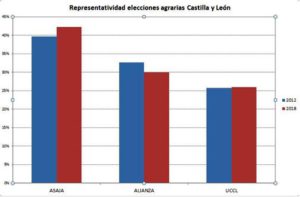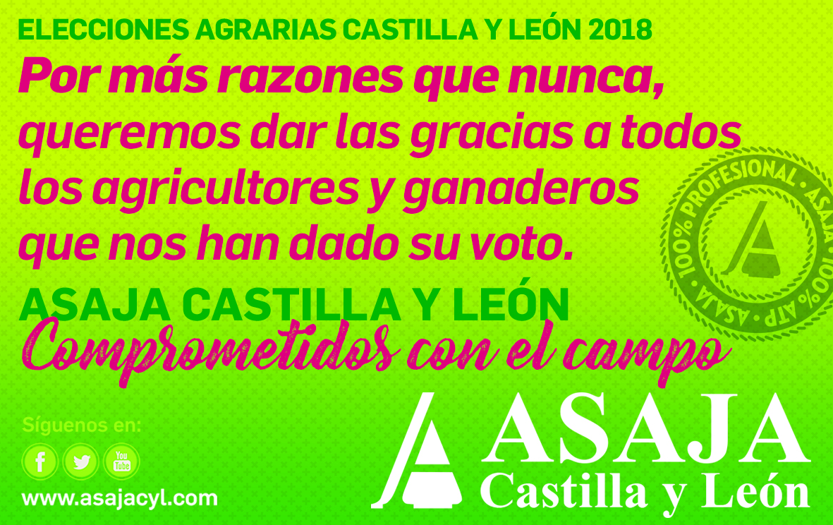 ASAJA ha ganado las elecciones al campo en Castilla y León, recibiendo el 42,31 por ciento de los votos, casi tres puntos más que en los anteriores comicios del año 2012. Los agricultores y ganaderos han respaldado el proyecto de ASAJA, que refuerza su liderazgo en la Comunidad Autónoma y es la única organización agraria plenamente regional, ya que solo ASAJA obtiene la representatividad en las nueve provincias de Castilla y León. Además, ASAJA no deja de crecer e incrementa elección a elección la distancia con la siguiente organización: si en 2007 la diferencia era de 1.111 votos, en 2012 aumentó a 1.982 y ahora se sitúa en 3.072 sufragios. En segundo lugar, se sitúa la Alianza UPA-COAG con el 30 por ciento de los sufragios, bajando un 2,68 por ciento, mientras que UCCL obtiene el 25,92 por ciento de las papeletas, resultado casi idéntico al de 2012.