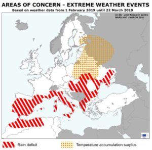 Ya en el boletín de seguimiento de cultivos de la Unión Europea de finales del mes de marzo se advertía una carencia de precipitaciones en la cuenca mediterránea que viene a corroborar lo acontecido hasta la fecha.