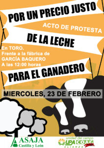 En esta ocasión las organizaciones convocantes trasladan su protesta a las puertas de GARCÍA BAQUERO, que es un referente en el sector lácteo de Castilla y León y del resto de España, y cuya empresa forma parte del colectivo industrial lácteo que sigue poniendo contra las cuerdas a los ganaderos de esta región, echando un pulso a las propias cooperativas en las negociaciones.