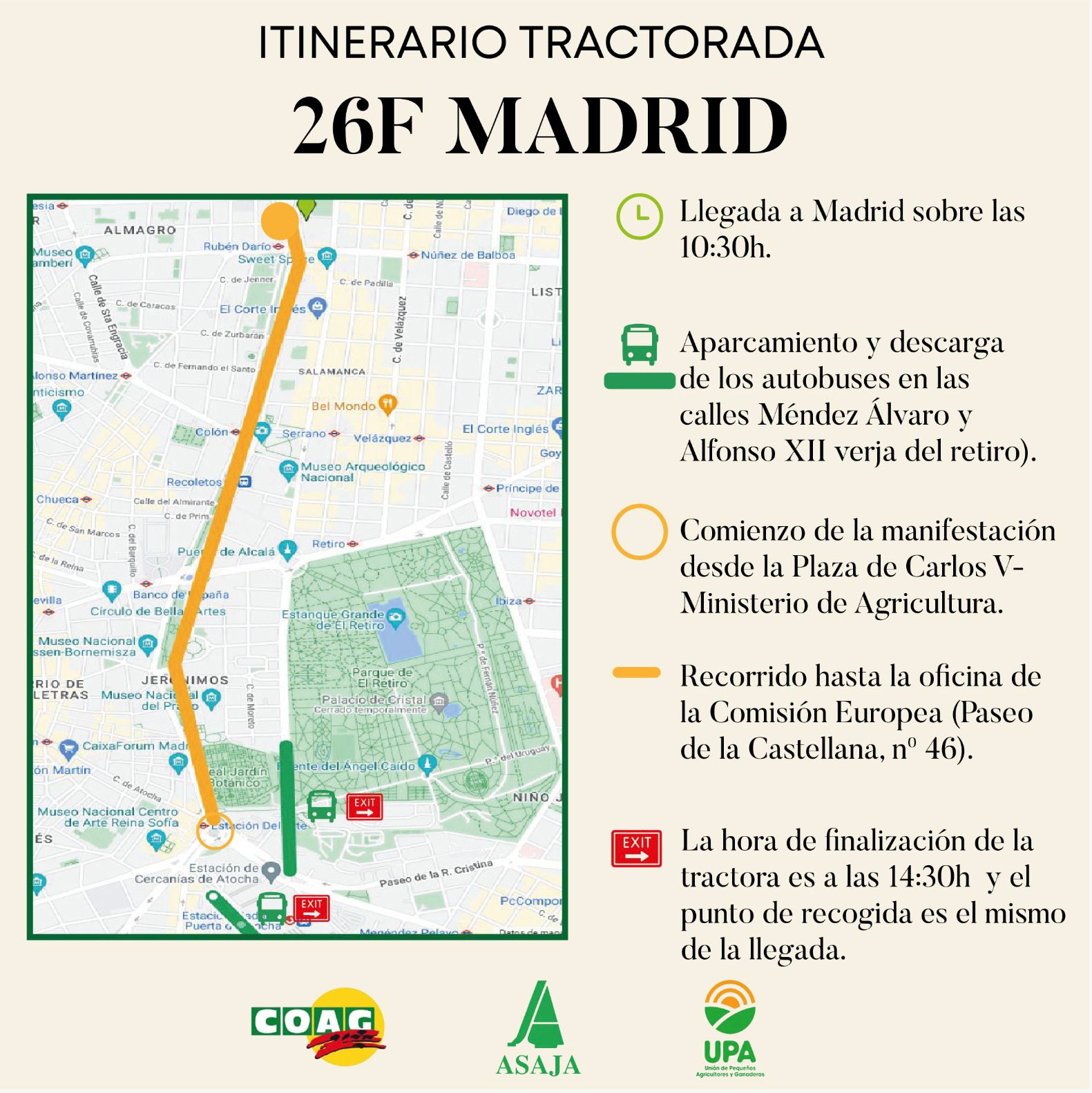 Desde allí, acompañados por miles de agricultores a pie, se dirigirán a la sede de la Oficina de la Comisión Europea (Paseo de la Castellana, 46), donde tendrán lugar las intervenciones de los máximos responsables de las organizaciones convocantes.