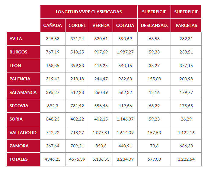 En concreto, España cuenta con 125.000 kilómetros de vías pecuarias que cubren todo el territorio peninsular y de las islas, que ponen de manifiesto que la trashumancia es una práctica extendida por todas las comunidades autónomas. Castilla y León cuenta con la red de vías pecuarias más extensa de nuestro país, con unos 22.000 kilómetros, que traducidos a superficie suponen 56.000 hectáreas. De ellos, 4.300 corresponden a cañadas, 4.900 a cordeles y 5.100 a veredas- las tres categorías reconocidas por la Ley en función de su anchura-, a lo que habría que añadir otras 1.200 hectáreas de descansaderos.