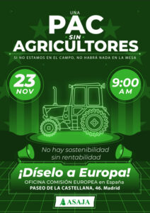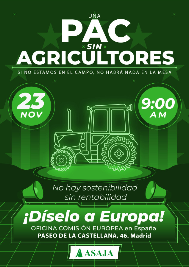 La Asociación Agraria Jóvenes Agricultores- ASAJA ha convocado para el próximo miércoles, 23 de noviembre, a las 09:00 horas, una concentración de agricultores y ganaderos ante la Oficina de la Comisión Europea en Madrid, en protesta por el “ninguneo” que esta institución viene demostrando con los verdaderos protagonistas de la agricultura europea.