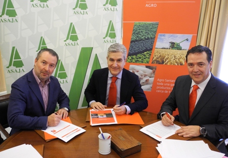Donaciano Dujo, presidente de ASAJA de Castilla y León, y Carlos Ranera González y Raúl Muñoz Morales, director territorial y director de Negocio Agro de Banco Santander en Castilla y León, respectivamente, han firmado un convenio de colaboración financiera y de servicios para ofrecer productos y servicios específicos a los agricultores y ganaderos socios y simpatizantes de la organización que domicilien el pago de la PAC en la entidad bancaria.