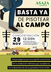 Basta ya de pisotear al campo. La Asociación Agraria Jóvenes Agricultores- ASAJA ha convocado para el próximo martes, 29 de noviembre, a las 12:00 horas, una concentración de agricultores y ganaderos ante el Ministerio de Transición Ecológica y Reto Demográfico en protesta por las “políticas tremendamente lesivas y los ataques injustificados” al sector agrario que está llevando a cabo este ministerio en materia energética, hidráulica y de protección de especies.