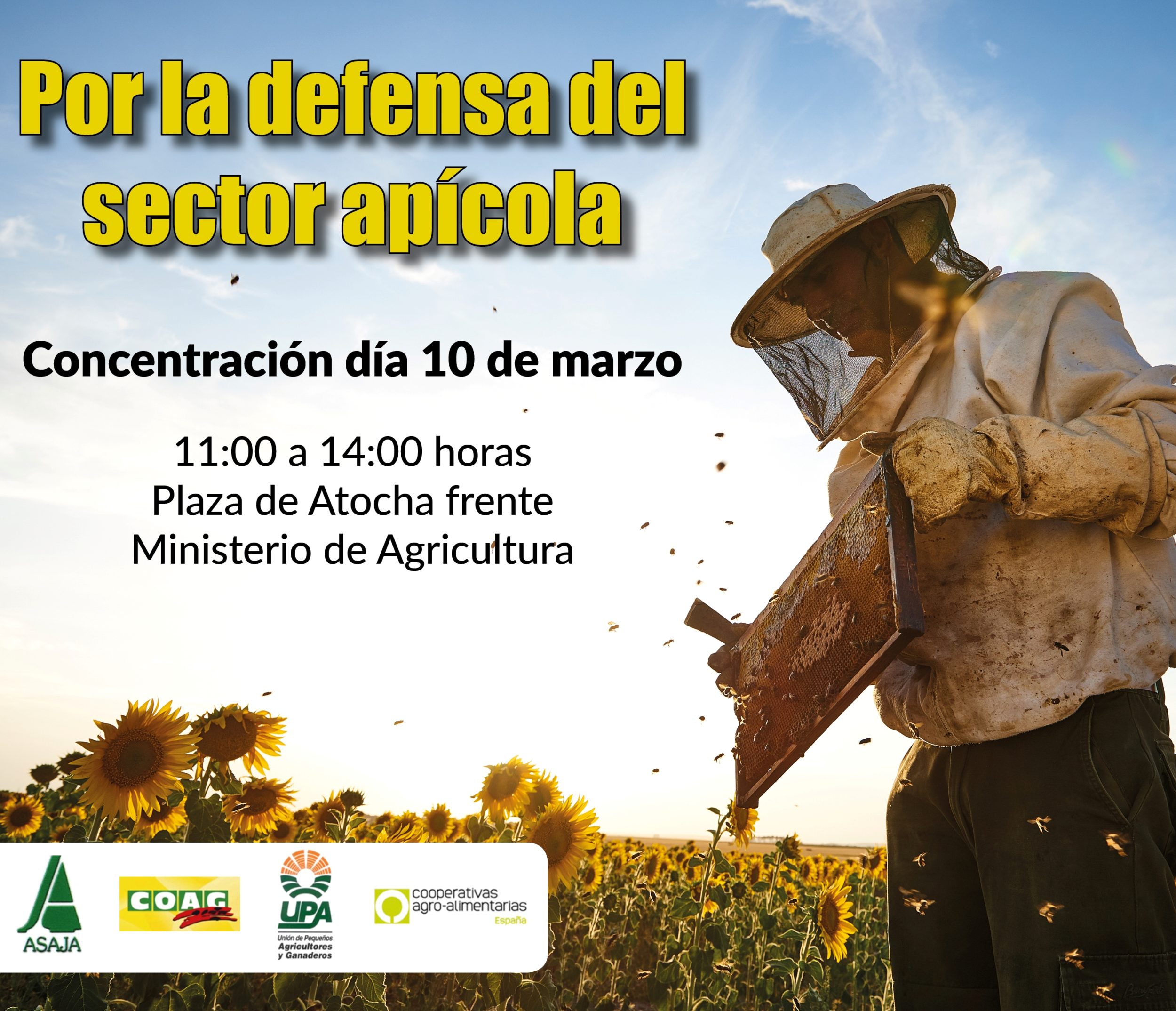 Las Organizaciones Profesionales Agrarias UPA, COAG y ASAJA, apoyadas por Cooperativas agroalimentarias de España, convocan al sector apícola a movilizarse el próximo día 10 de marzo en Madrid, delante del Ministerio de Agricultura (Atocha), para visibilizar ante la sociedad la grave situación por la que atraviesan las familias que tienen como base de su economía la apicultura.
