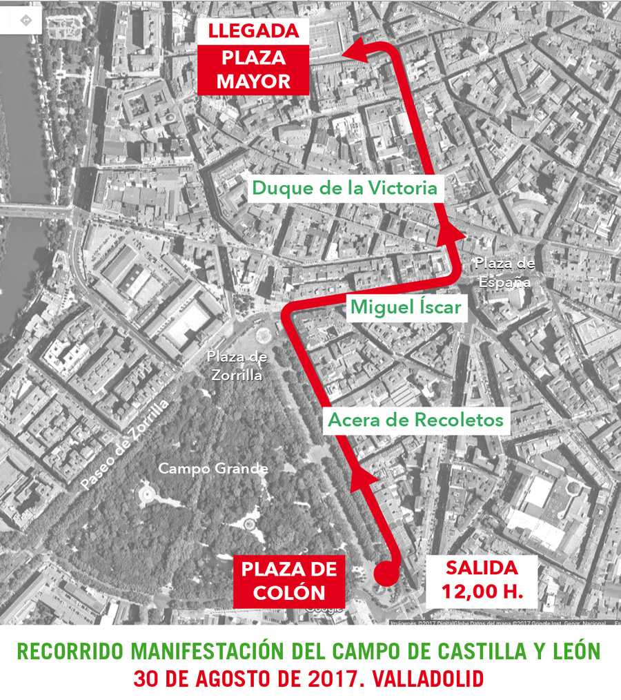 A partir de las 12 está prevista la concentración de los manifestantes en la Plaza de Colón de Valladolid. El recorrido será Plaza de Colón, Acera de Recoletos, Miguel Íscar, Duque de la Victoria, Ferrari y, finalmente, Plaza Mayor, donde intervendrán los líderes regionales de las organizaciones agrarias.