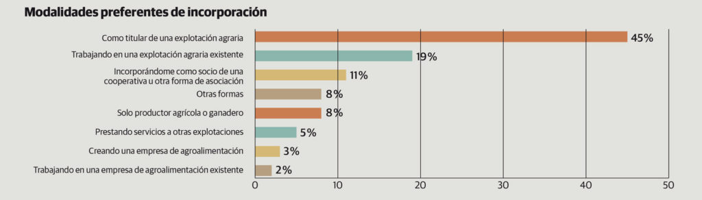 Un dato importante es que la mayoría, un 84 por ciento, tiene vinculación familiar con la agricultura (padres, tíos, etc.). De ellos, un 70 por ciento aspira a dedicarse a la agricultura y/o ganadería a tiempo completo, y el 30 por ciento prevé compatibilizarla con otra actividad. Casi el 60 por ciento de los participantes de la encuesta son ya jóvenes agricultores o ganaderos, y se incorporaron al sector con una edad media de 27 años.