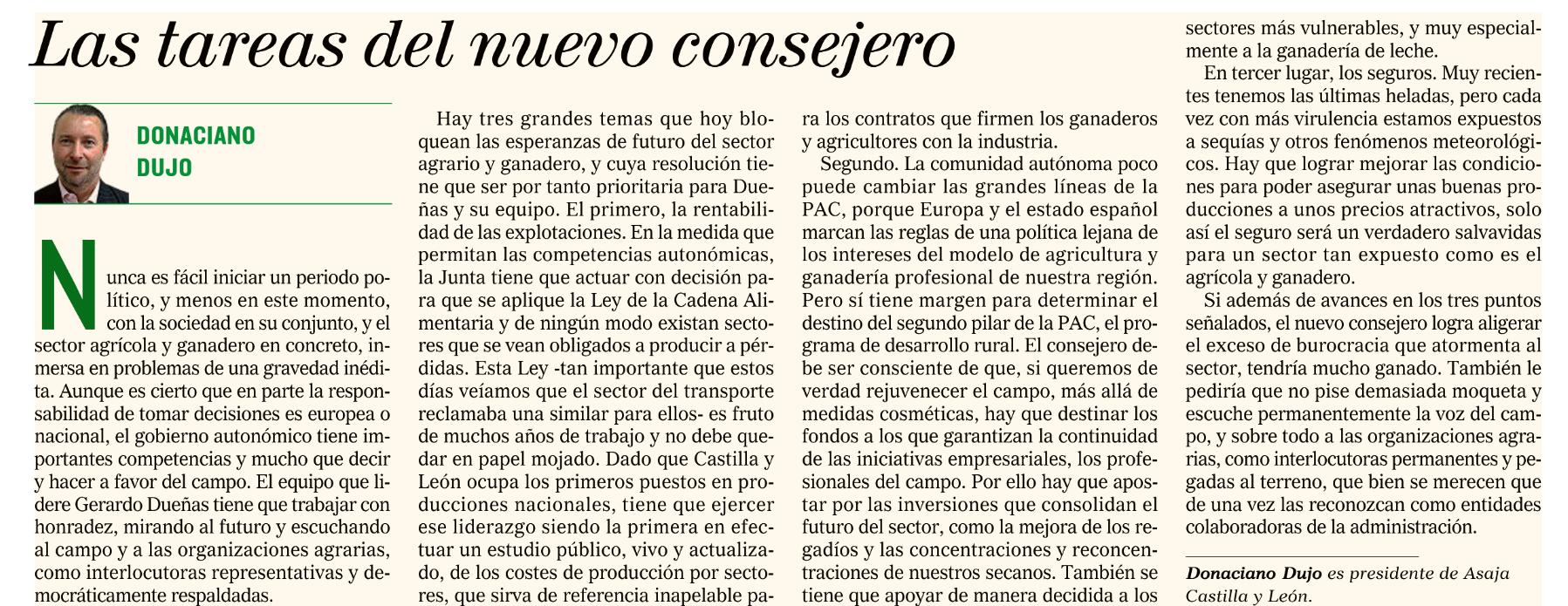 Hay tres grandes temas que hoy bloquean las esperanzas de futuro del sector agrario y ganadero, y cuya resolución tiene que ser por tanto prioritaria para Dueñas y su equipo. El primero, la rentabilidad de las explotaciones. En la medida que permitan las competencias autonómicas, la Junta tiene que actuar con decisión para que se aplique la Ley de la Cadena Alimentaria y de ningún modo existan sectores que se vean obligados a producir a pérdidas. Esta Ley -tan importante que estos días veíamos que el sector del transporte reclamaba una similar para ellos- es fruto de muchos años de trabajo y no quedar en papel mojado. Dado que Castilla y León ocupa los primeros puestos en producciones nacionales, tiene que ejercer ese liderazgo siendo la primera en efectuar un estudio público, vivo y actualizado, de los costes de producción por sectores, que sirva de referencia inapelable para los contratos que firmen los ganaderos y agricultores con la industria.