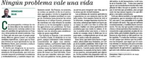 Por fortuna en España, y en concreto en Castilla y León, la situación no es tan grave, aunque tristemente todos tenemos conocimiento de algún caso similar. Cuántas vueltas y sufrimiento habrá dado esa persona a los problemas que tiene, cuántas veces los habrá intentado solucionar, y qué habrá pasado por su cabeza antes de tomar esa fatal decisión. Unos dicen que son cobardes; otros que valientes. Son solo palabras vacías, puesto que no sirven para recuperar una vida, que es lo único que de verdad tenemos.