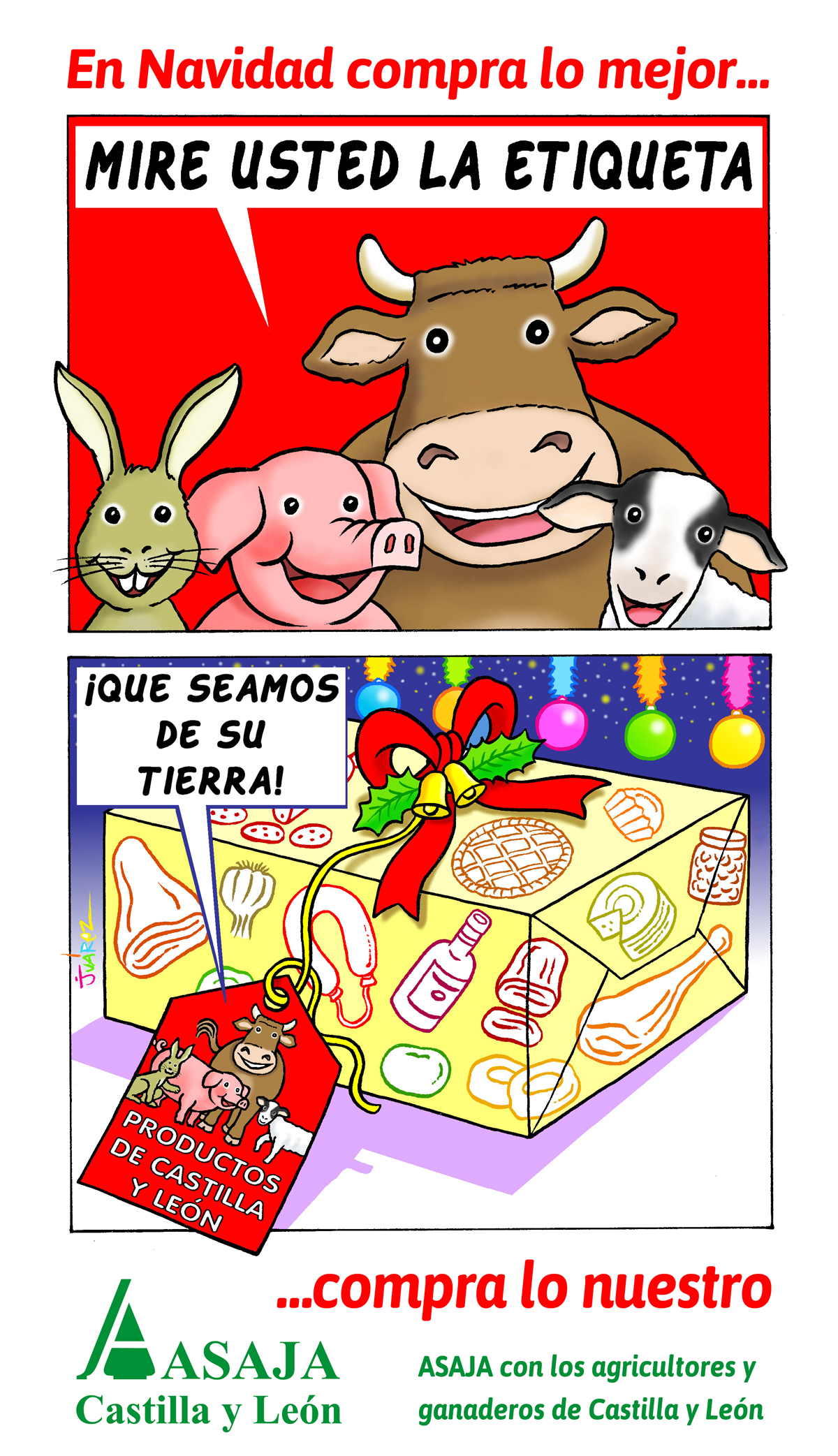 Coincidiendo con las fechas navideñas, y como ya es habitual, ASAJA solicita a los consumidores que apoyen al sector agroganadero de Castilla y León pidiendo en sus puntos de distribución habituales productos autóctonos. Esta petición se refuerza con el mensaje “En Navidad compra lo mejor, compra lo nuestro”, que centra la felicitación que la organización agraria envía y transmite estos días por las redes sociales (Twitter y Facebook) y publicaciones propias, con el ánimo de involucrar “en estas fechas navideñas, y también a lo largo de todo el año”, al mayor número de consumidores posibles en la defensa del producto local, como mejor forma de apoyar al sector agrícola y en especial al ganadero de Castilla y León. Por ello, este año la organización agraria insiste en la importancia de leer el etiquetado de los alimentos que se compran, para verificar su origen.
