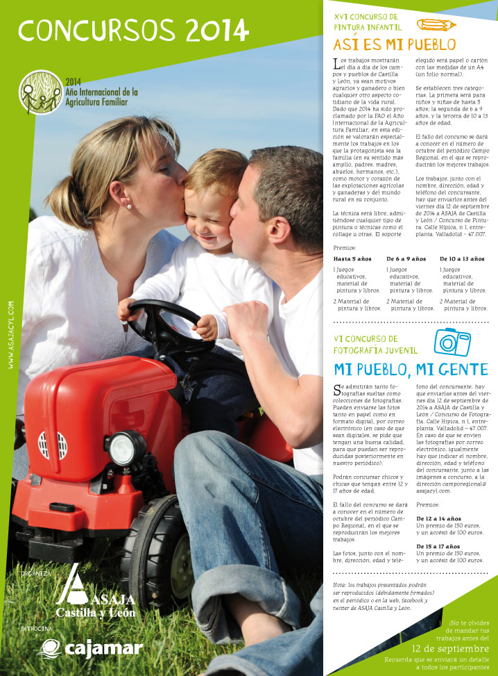 Hasta el próximo 12 de septiembre está abierto el plazo de presentación de trabajos para los dos concursos dirigidos a niños y jóvenes que cada año organiza ASAJA de Castilla y León, con el apoyo de CAJAMAR, con el ánimo de que aprendan a valorar el medio rural de nuestra Comunidad Autónoma. Dado que 2014 ha sido proclamado por la FAO el Año Internacional de la Agricultura Familiar, en esta edición se valorarán especialmente los trabajos en los que la protagonista sea la familia (en su sentido más amplio, padres, madres, abuelos, hermanos, etc.), como motor y corazón de las explotaciones agrícolas y ganaderas y del mundo rural en su conjunto.