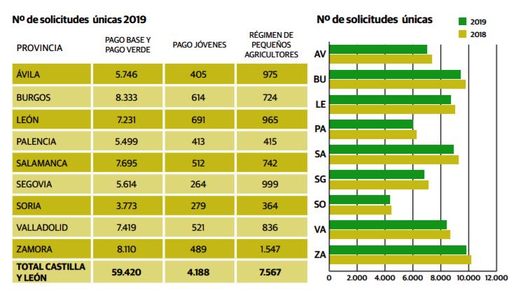 Los datos oficiales apuntan que en los últimos diez años ha habido en Castilla y León una significativa reducción de las solicitudes únicas de ayudas de la Política Agrícola Común (PAC). En esta campaña, recién concluida, se han registrado 69.399 solicitudes, 28.851 menos que hace diez campañas, lo que significa una disminución del 29 por ciento desde 2010. El descenso es apreciable en toda la Comunidad Autónoma, con porcentajes que oscilan entre el 22 y el 38 por ciento, según provincias. Además, hay que tener en cuenta que unas 7.567 solicitudes se acogen al régimen simplificado (importes inferiores a 1.250 €), un grupo en el que predominan perceptores que tienen la agricultura como renta complementaria, con lo que se reduce aún más el número de titulares que son profesionales del sector. Esa profesionalización explica por qué no desciende la superficie declarada: aunque este año hay 2.633 solicitudes menos que el anterior, la superficie se mantiene prácticamente igual, sumando alrededor de 3,4 millones de hectáreas de cultivos herbáceos y barbechos, y cerca de 1,8 millones de pastos permanentes. Es decir, se mantiene el mismo nivel de actividad, gracias a una mayor eficacia de los recursos.