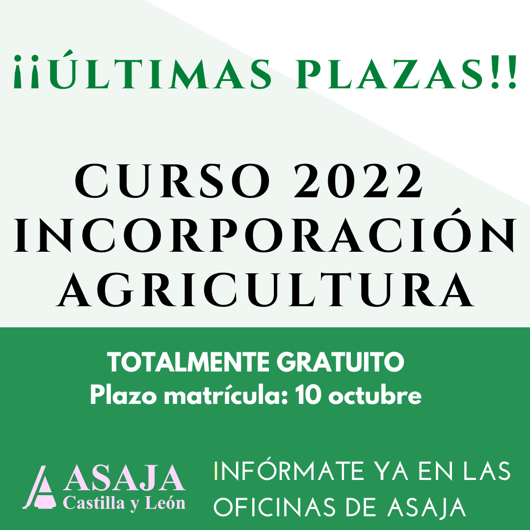 Desde ASAJA Castilla y León queremos avisar a todos los interesados en apuntarse a los cursos de incorporación a la empresa agraria, modalidad online, que lo hagan antes del LUNES 10 DE OCTUBRE.