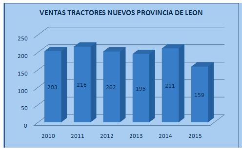 La venta de tractores nuevos en la provincia de León cayó el pasado año 2015 el 24,64% respecto al ejercicio anterior de 2014, al pasar de los 211 tractores matriculados a tan solo 159. Si tomamos como referencia los cinco años anteriores, en el periodo 2010/2014 se matricularon una media de 205 tractores a año, por lo que las cifras de 2015 representan una caída del 22,43% respecto a ese dato.