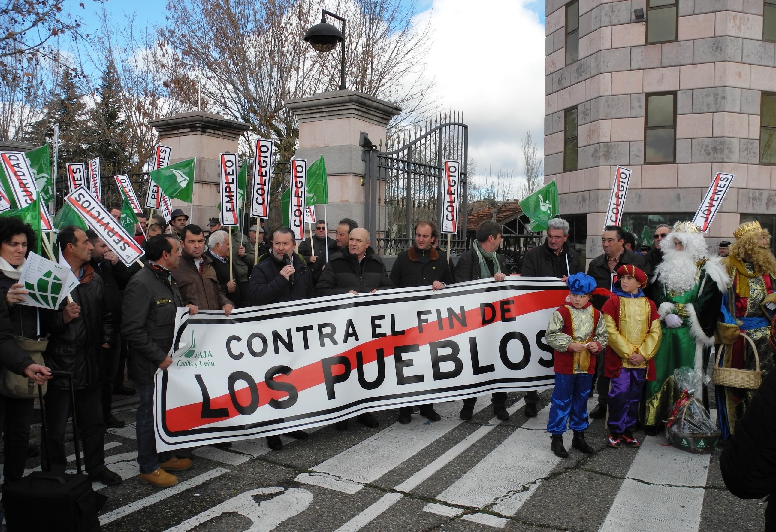 Como viene siendo habitual por estas fechas, los Reyes Magos de ASAJA de Castilla y León han recorrido Valladolid para entregar carbón a aquella institución, empresa o, como en este caso, administraciones, que no se han esforzado como debieran a lo largo del año 2015. Varios centenares de agricultores y ganaderos de todas las provincias de la región han participado en la protesta, cuya cabecera se abría con una pancarta con el lema “Contra el fin de los pueblos”. Además, los manifestantes llevaban otras pancartas de mano que recogían las principales demandas del medio rural, con los mensajes “Jóvenes”, “Seguridad”,”Colegio”, “Sanidad”, “Internet”, “Empleo”, “Vivienda”, “Transporte”, “Pensiones” y “Servicios”.