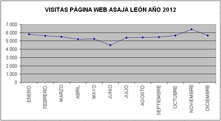 La página web de ASAJA de León sigue creciendo en número de visitas y alcanzó su pico más alto en el mes de noviembre del pasado año 2012, cuando se registraron 6.401, representando un incremento respecto a la cifra más alta del año 2011 del 23,4%. El promedio de visitas mensuales durante el año 2012 fue de 5.497 –visitante único-, lo que la convierte en la web agraria más visitada dentro de las que pueden ser comparables. En la provincia de León ASAJA es la única organización que presta al sector un servicio de estas características y además está abierto también de forma gratuita a quienes no son socios.