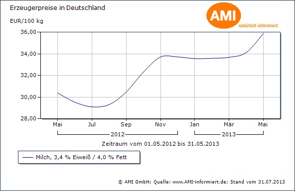 Según la prestigiosa agencia alemana Agricultural Market Information (AMI), el precio de la leche de vaca al productor en Alemania, en el mes de mayo, se situó en 358,8 euros por tonelada, siguiendo una tendencia alcista de los últimos meses con tendencia todavía a alcanzar niveles más altos. La menor producción estacional en Alemania y en otros grandes productores y exportadores como Francia, así como la tendencia alcista en mercados internacionales como Nueva Zelanda, parecen la causa de este repunte de precios que tanto necesita el sector para llegar a un equilibrio que permita cubrir gastos y obtener un legítimo beneficio.