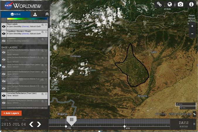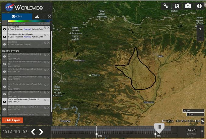 En la imagen de satélite, se observa cómo estaban desarrollados los cultiovos en los regadíos del Páramo de León (Páramo Alto, Medio, Bajo y vegas adyacenes) a fecha 4 de julio de 2015 y 2016 respectivamente.