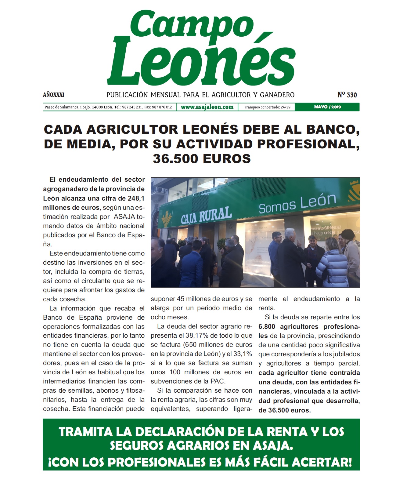 Con el número 330 que ha salido hoy, se cumplen treinta años de la publicación de forma ininterrumpida de Campo Leonés, una revista mensual en papel presa que es el medio de difusión de ASAJA con sus socios, empresas, institución y diversas entidades relacionadas con el sector. Campo Leonés se editó por vez primera en mayo de 1989 y desde entonces se han publicado once números cada año, recogiendo en sus páginas las noticas relacionadas con el sector, los cambios normativos, las diferentes líneas de ayuda, los anuncios de compra venta entre particulares, y sobre todo se ha utilizado para canalizar las distintas reivindicaciones que ha llevado a cabo la principal organización agraria de la provincia.