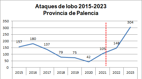 Palencia es, después de Burgos (+627 %), la provincia de Castilla y León en la que más se han incrementado (+190 %) los ataques del lobo en 2023 con respecto a 2021, año en cuyo cuarto trimestre ya obró el cambio de estatus de la especie. Con respecto a 2022, primer año completo con prohibición de caza en toda la comunidad, al norte y al sur del río Duero, también Palencia (+105 %) ha sido la segunda provincia con más aumento proporcional en el número de ataques, sólo superada por Burgos (+208 %).