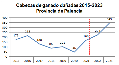 Los datos y los gráficos que aparecen al final de esta información muestran cómo claramente se disparan los casos de ataques de lobo a la ganadería palentina, así como las muertes de cabezas ocasionadas en el último bienio, y especialmente en 2023, como sucede en otras provincias de Castilla y León, lo que revela que la especie no se está extinguiendo, ni mucho menos.