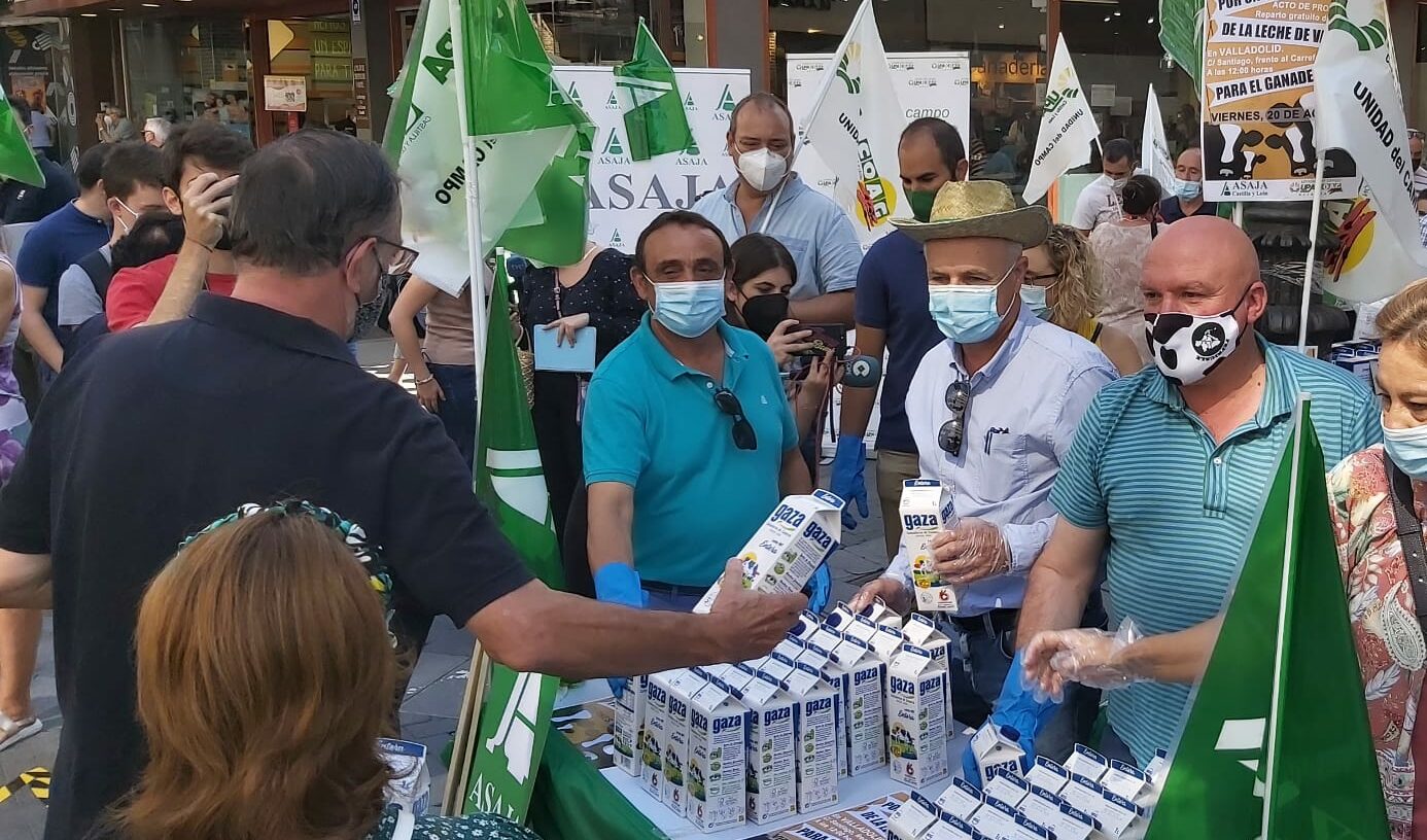 En la mañana de hoy, ASAJA-Palencia ha estado presente en el reparto de leche organizado por ASAJA y la Alianza UPA-COAG en Valladolid. Se han repartido 1.500 litros de leche producida en Castilla y León en el centro neurálgico de Valladolid, concretamente la calle Santiago, que es una calle peatonal que une la Plaza Mayor con la Plaza de Zorrilla y es frecuentada por gran número de viandantes.