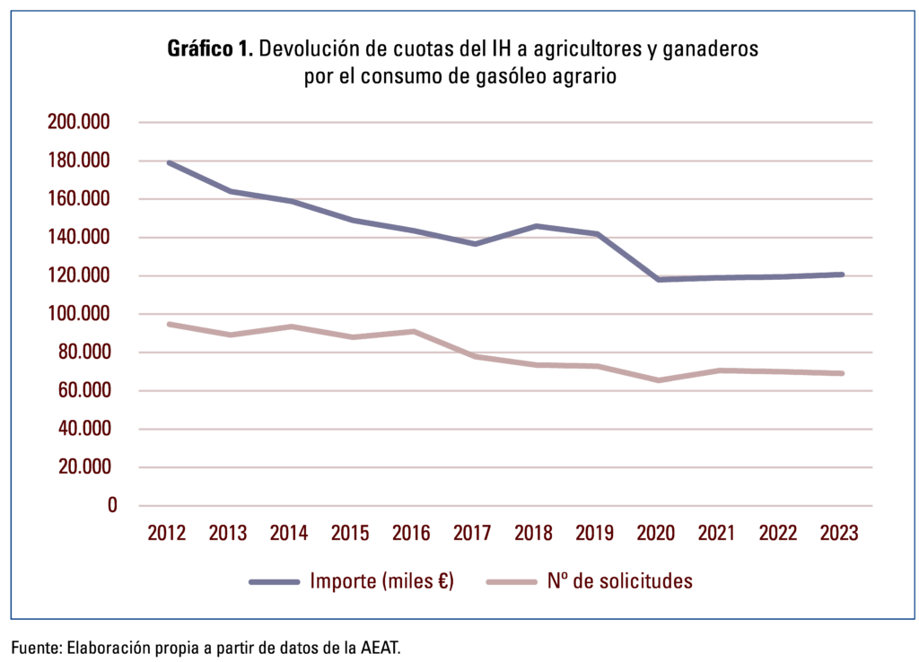 La cifra de solicitantes de devolución parcial de este tributo ha ido bajando a nivel nacional, como se percibe claramente en esta gráfica del propio Ministerio de Agricultura con datos de la Agencia Tributaria, si bien se aprecia una cierta estabilización en el último cuatrienio, en torno a los 70 000 solicitantes en toda España y un importe global devuelto de unos 120 millones de euros. Las cifras están, en todo caso, lejos de las que se daban en 2012, cuando la devolución rondaba los 180 millones de euros./