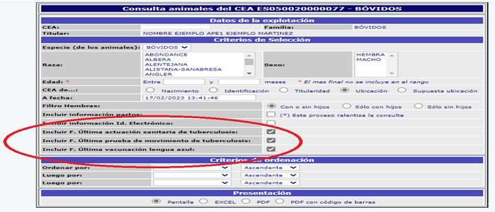 Además, se pueden hacer consultas sobre la situación sanitaria de los animales de la explotación, ya sean saneamientos o vacunaciones. Esta consulta se realiza en la opción «Consulta de animales por CEA», marcando las tres últimas opciones: «Incluir F. Última actuación sanitaria de tuberculosis», «Incluir F. Última prueba de movimiento de tuberculosis» e «Incluir F. Última vacunación lengua azul». Una vez marcadas y eligiendo el modo de presentación (pantalla, Excel, PDF) se obtiene un listado actualizado con las últimas fechas.