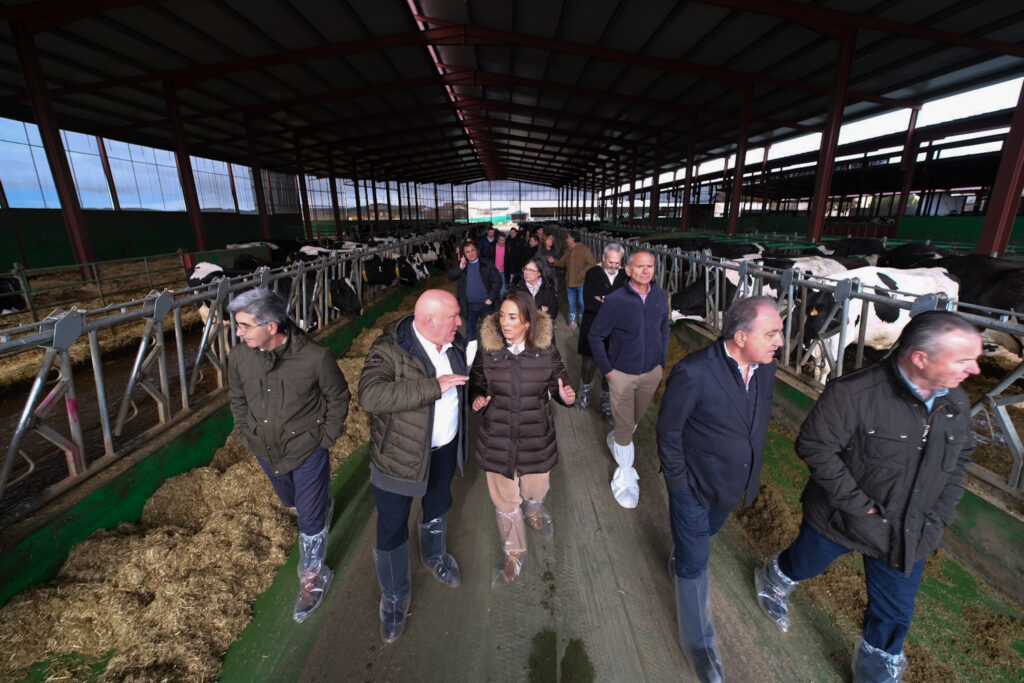 La consejera de Agricultura y el presidente de AFRIPA conversan durante la visita a la explotación ganadera de Hermanos Fernández Martín, en Dehesa de Romanos. (Foto Junta de Castilla y León)