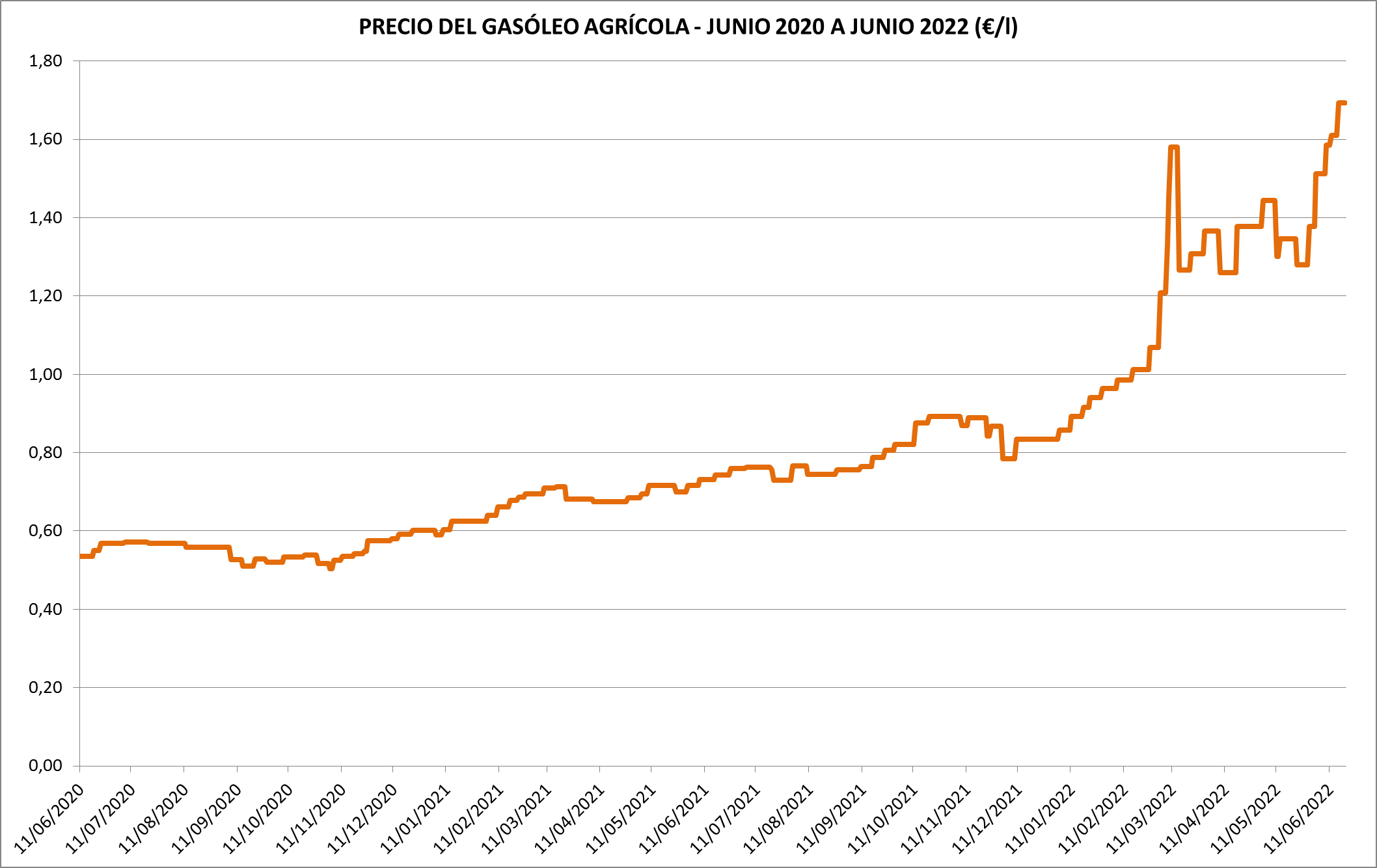 Respecto a junio de 2021, el precio del gasóleo agrícola se ha incrementado un 120%, la energía eléctrica un 180%, y los piensos para la alimentación del ganado un 36% para el vacuno y en un 49% para el porcino. Con estos costes de producción resulta de todo punto inviable el futuro de las explotaciones agropecuarias, máxime si a esto sumamos los efectos que la sequía está dejando en sector, con importantes mermas de producción (cereales -30%), y la inestabilidad y incertidumbre provocadas en los mercados internacionales como consecuencia de la invasión de Ucrania.