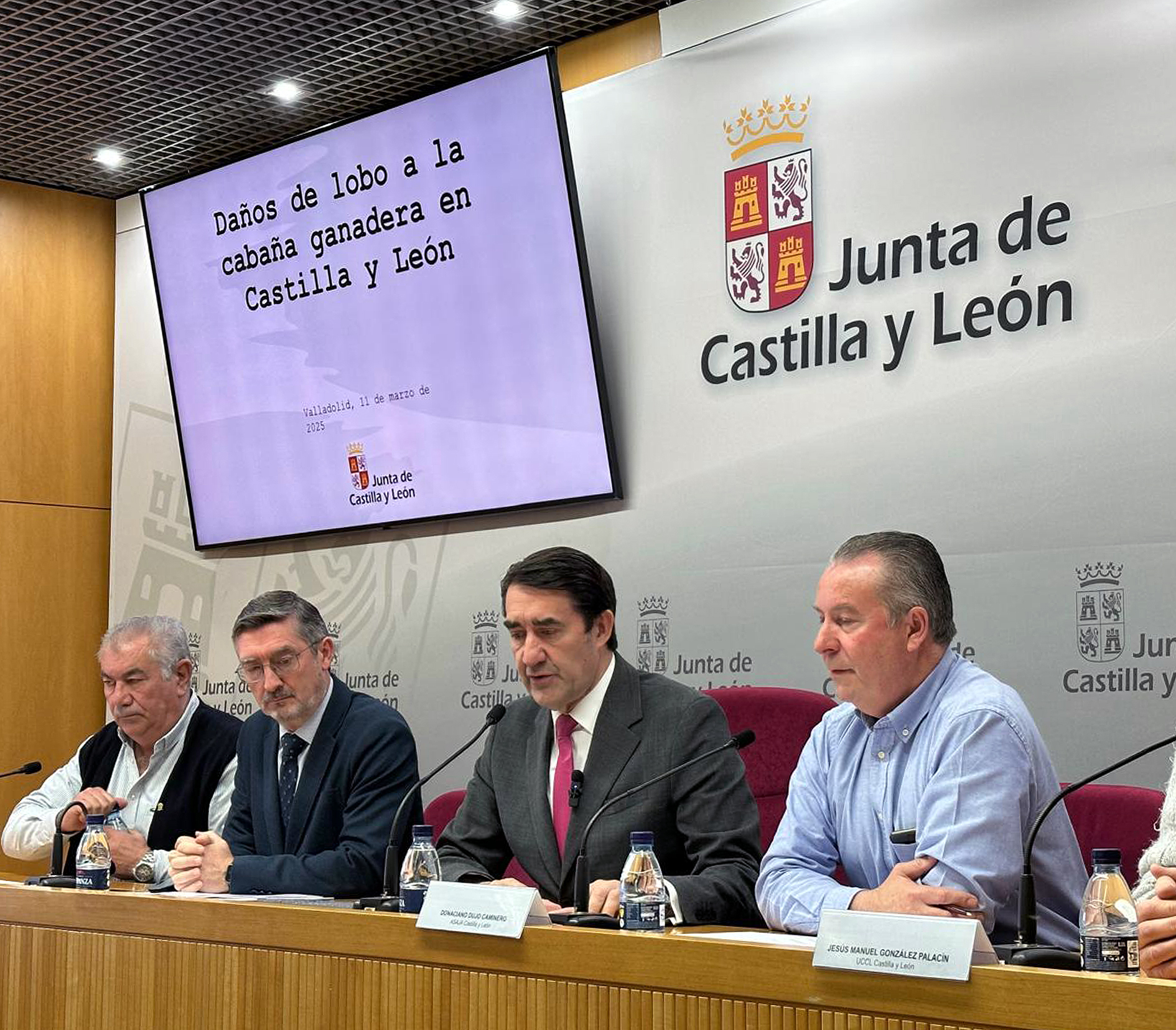 Donaciano Dujo (segundo por la derecha), presidente de ASAJA-Castilla y León, junto al consejero de Medio Ambiente, Juan Carlos Suárez-Quiñones (centro), durante la presentación de los datos de ataques del lobo en 2024, celebrado esta semana.