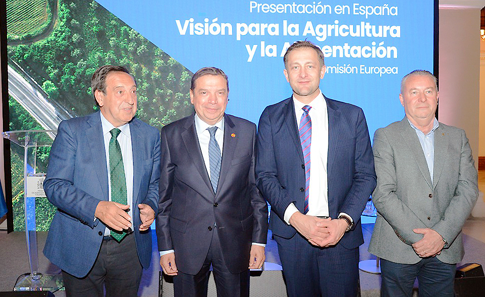 De izquierda a derecha, Pedro Barato, el ministro Luis Planas, el comisario Chistophe Hansen y Donaciano Dujo, este jueves en Madrid, durante la presentación del documento de la ComisióN Europea ‘Visión para la Agricultura y la Alimentación’.
