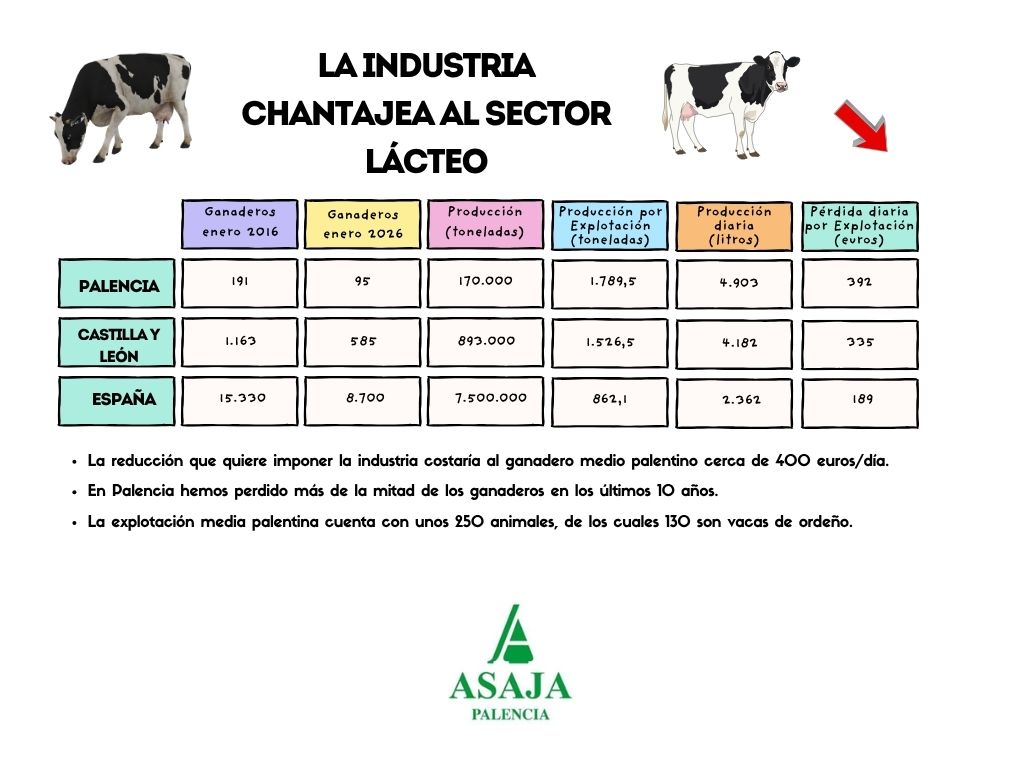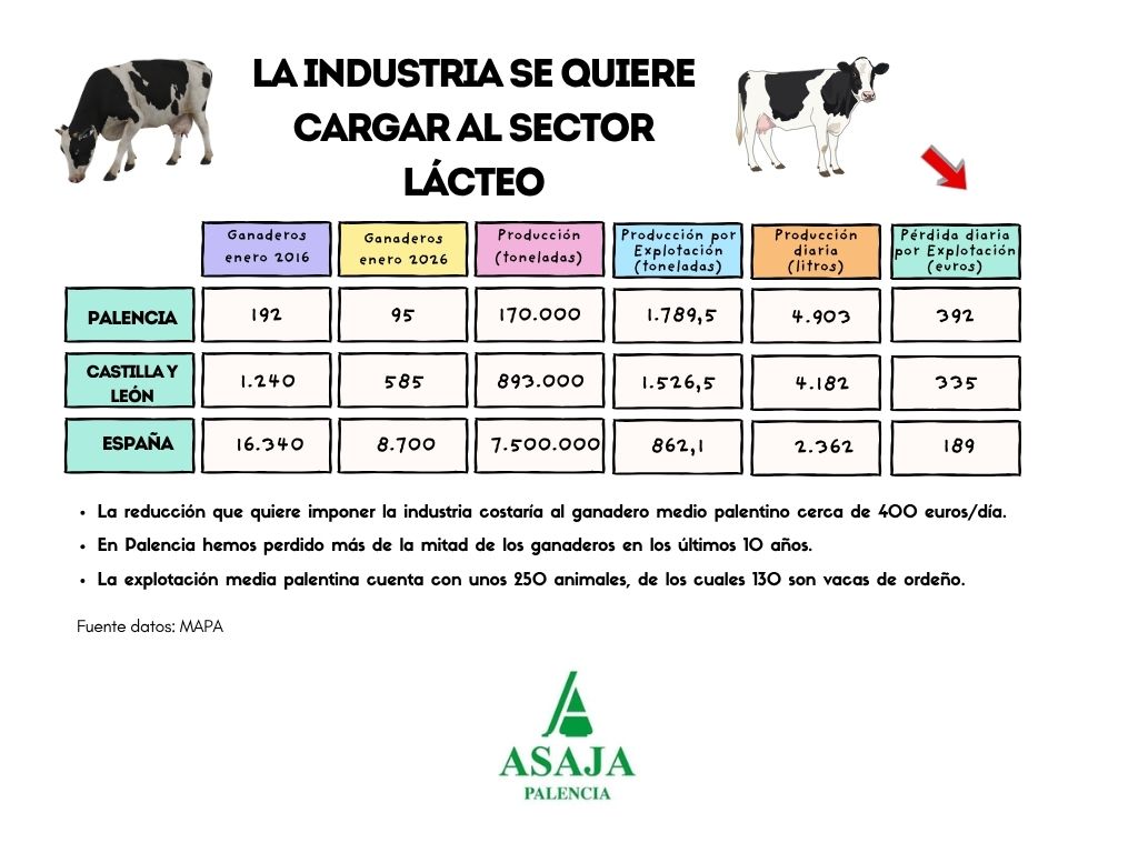 ASAJA insiste en que, si no se adoptan medidas urgentes, el sector se enfrenta a un escenario de abandono de explotaciones con consecuencias directas sobre el empleo, el tejido rural y la soberanía alimentaria. Por ejemplo, una explotación tipo de la provincia de Palencia 392 euros al día con la bajada propuesta por la industria.