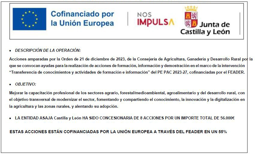 ASAJA-Castilla y León organiza del 14 de junio al 8 de septiembre de 2024 un curso telemático de incorporación a la empresa agraria, acción formativa que cofinancia la Unión Europea a través del FEADER en un 55 %. Las plazas son limitadas.