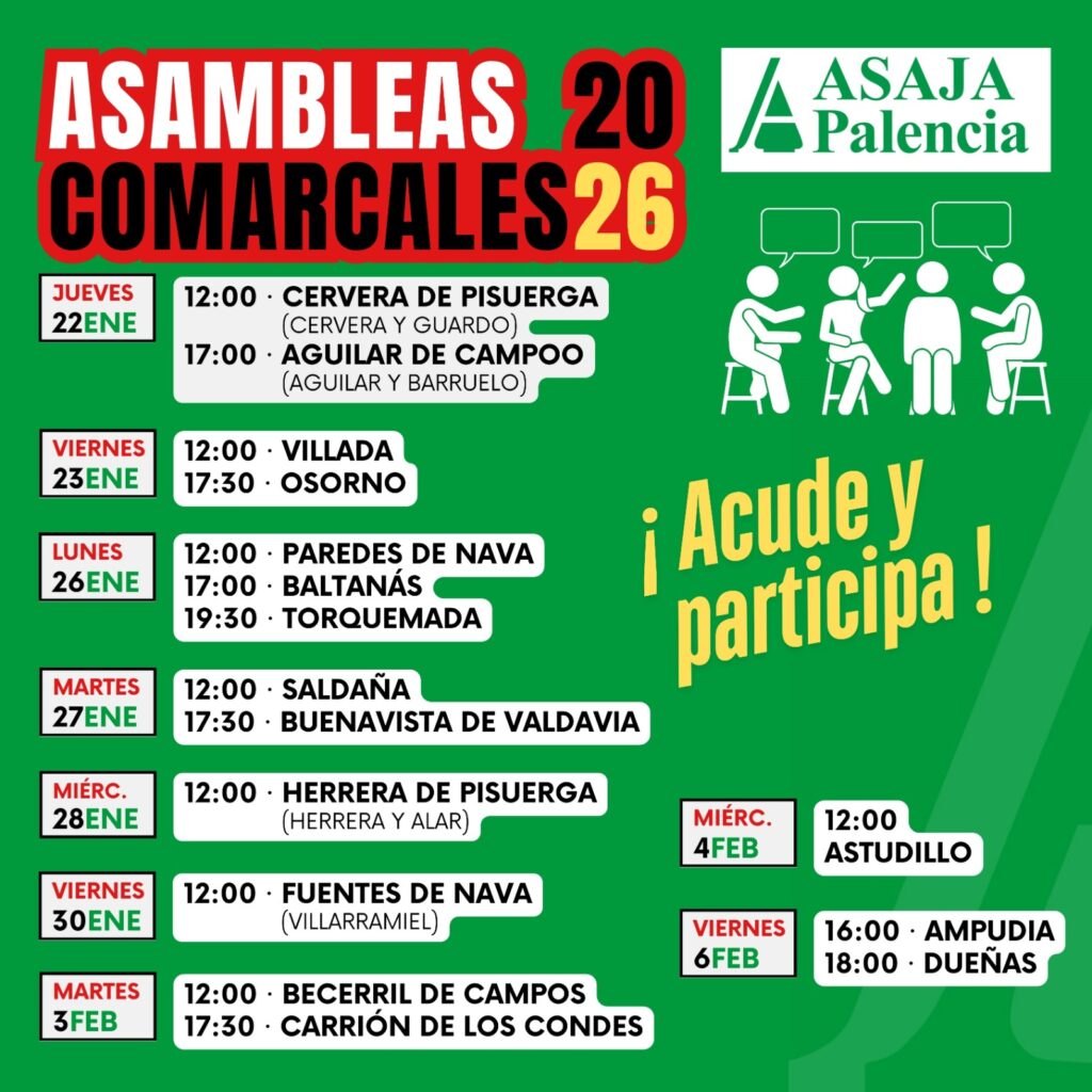 ASAJA-Palencia anima a los asociados a participar de forma activa en las 16 asambleas comarcales que nuestra organización que han comenzado el 22 de enero en Cervera y se celebrarán hasta el 6 de febrero.