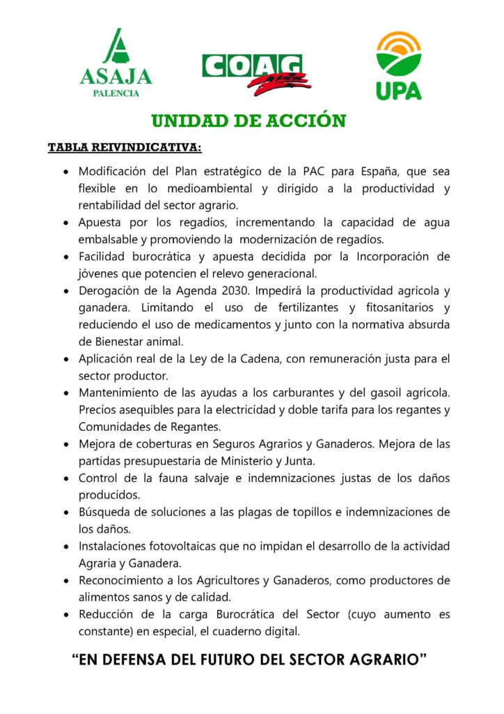 ASAJA-Palencia, junto a la alianza UPA-COAG, organizaciones representativas del sector agroganadero de la provincia, llaman a la movilización el próximo miércoles 14 de febrero. Los agricultores y ganaderos palentinos están convocados a manifestarse para reclamar un cambio profundo del marco normativo y defender el futuro de un sector cuya viabilidad se ve cada vez más amenazada. Inicialmente, se han previsto dos concentraciones de los profesionales, con sus tractores, en Osorno y Magaz de Pisuerga, con una posible marcha de esta última ‘tractorada’ hacia la capital palentina para recorrer las calles de la ciudad y dar más visibilidad a la manifestación.