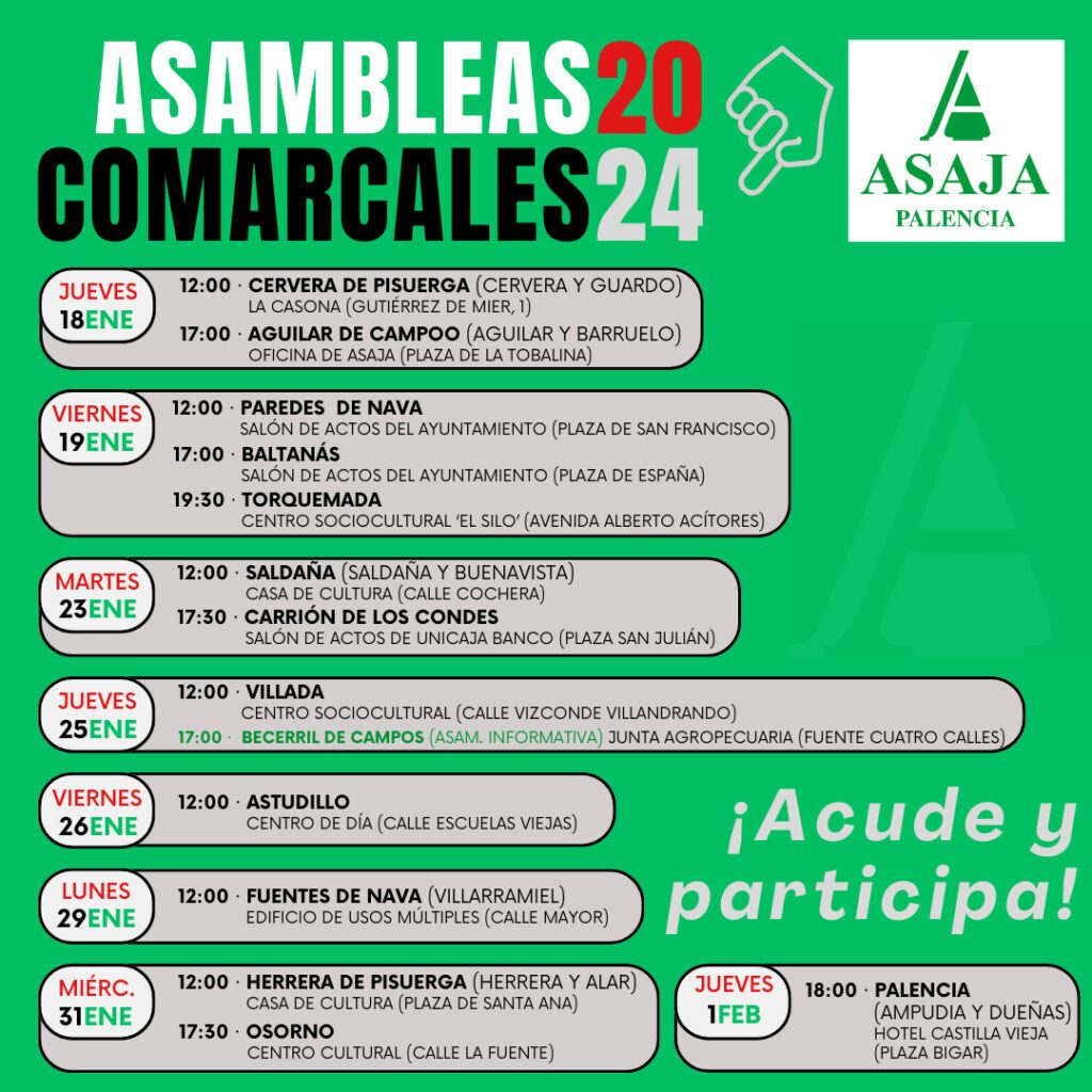 ASAJA-Palencia enfila esta semana la recta final de su ciclo de asambleas comarcales de 2024, con las que celebrará este miércoles 31 de enero en HERRERA DE PISUERGA (12:00 horas), para esta comarca y la de ALAR DEL REY, y en OSORNO (17:30 horas), y la que el jueves 1 de febrero (18:00 horas | Hotel Castilla Vieja) cierra en la ciudad de Palencia, correspondiente a las comarcas de AMPUDIA y DUEÑAS.