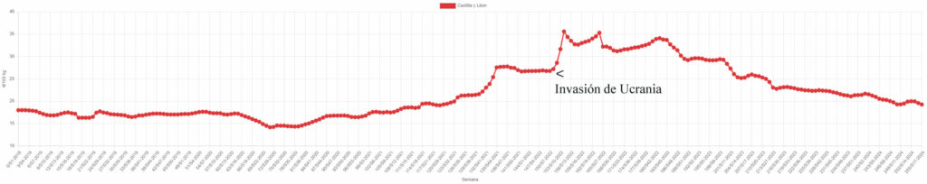 Los dos gráficos adjuntos muestran cómo la cotización de los cereales no ha dejado de depreciarse desde hace más de dos años y se sitúan ya en niveles por debajo de los que tenían tanto el trigo (arriba) como la cebada (abajo) antes de la invasión de Ucrania del 24 de febrero de 2022. Ciertamente, en los meses previos ya se había registrado un alza del precio del grano, movimiento que anticipaba el conflicto bélico; pero esa misma inflación, e incluso superior, también se observaba en los meses previos en los costes de producción, como saben bien los agricultores por los gastos que afrontaron en la sementera de 2021. Ambos gráficos corresponden al precio medio semanal del trigo y la cebada en Castilla y León en el periodo enero de 2019-junio de 2024, extraídos del Observatorio de Precios de la Consejería de Agricultura de la Junta.