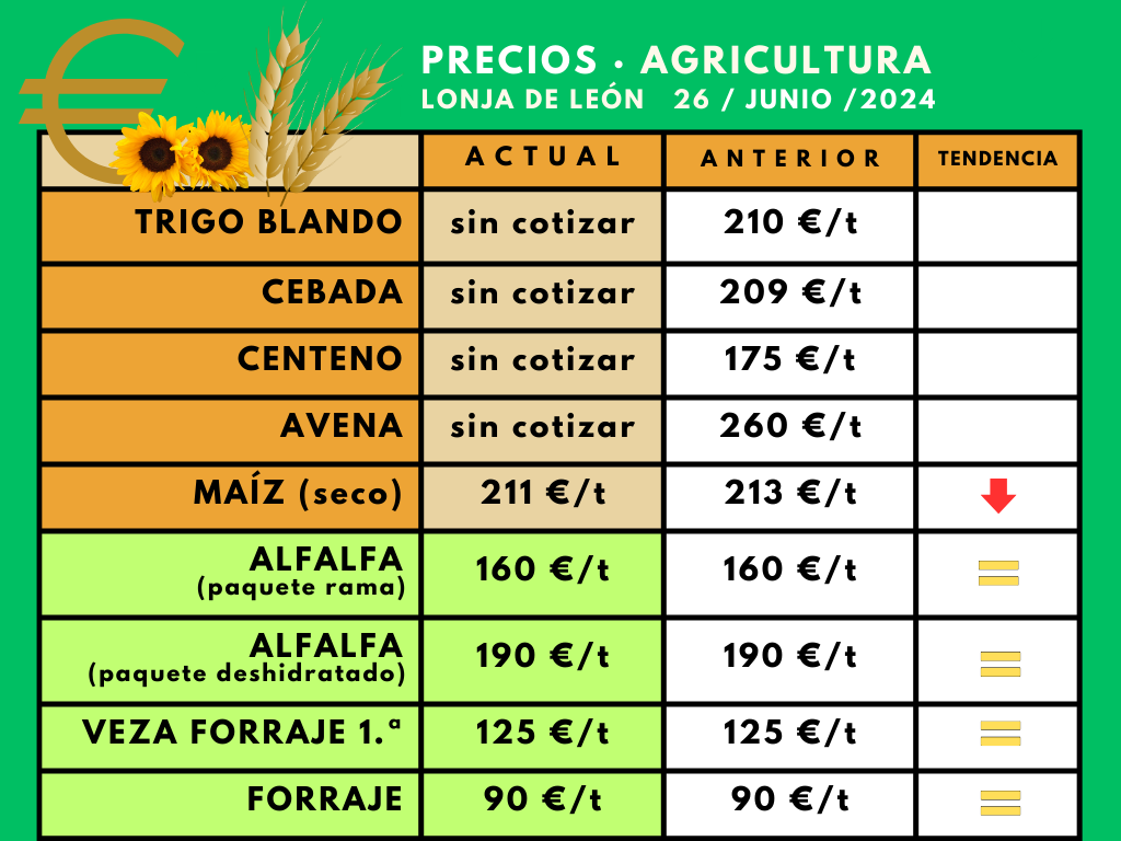 COMPÁS DE ESPERA. Bajo estas líneas ofrecemos los últimos precios de cereales y cultivos forrajeros de la Lonja de León, donde ya llevan dos semanas sin cotizar los cereales (salvo el maíz, que perdió dos euros por tonelada en la sesión del miércoles 26 de junio), a la espera de transacciones significativas que indiquen precios de referencia con la cosecha de 2024 en marcha.