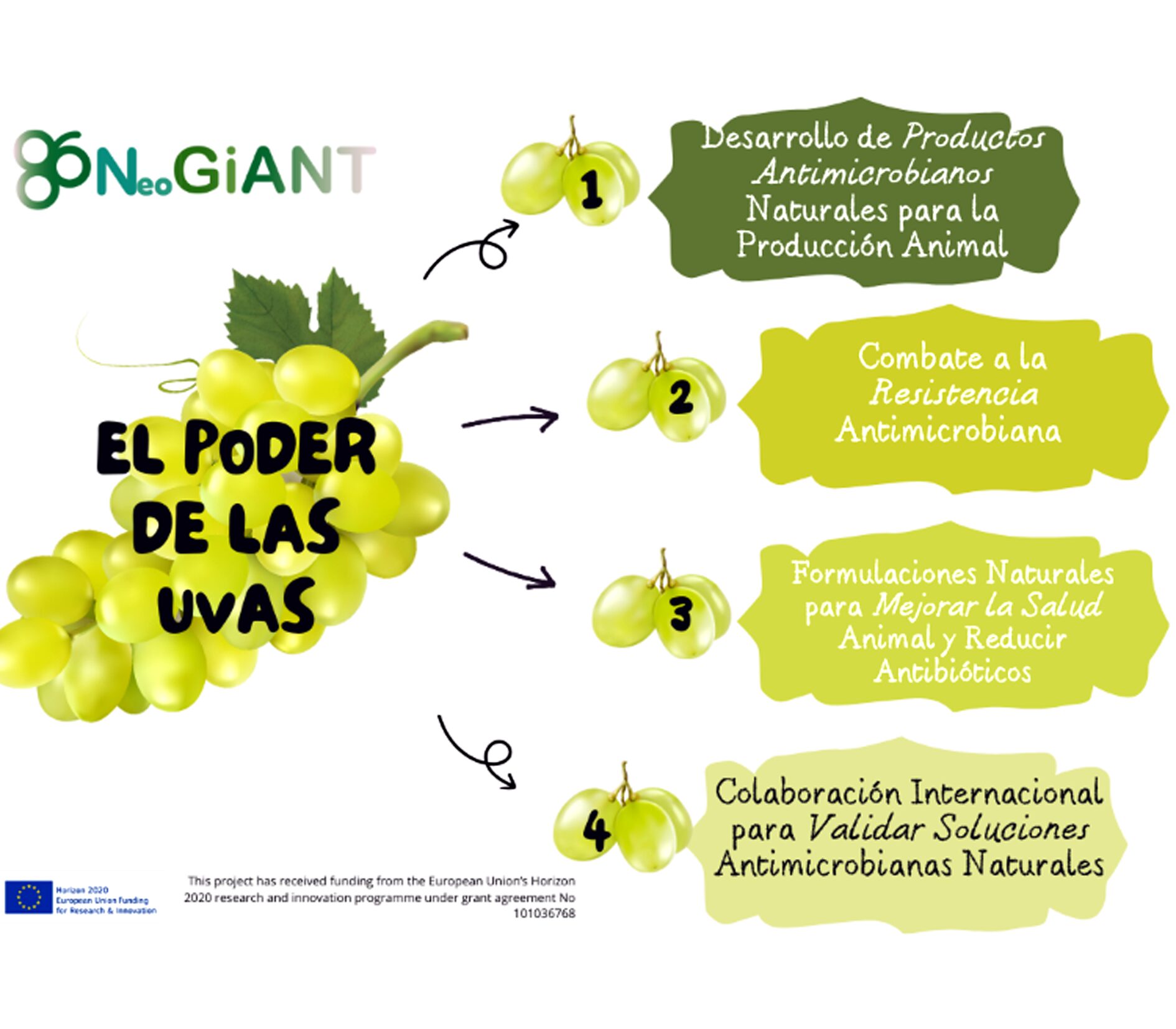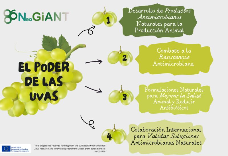 NeoGiANT se centra en crear aditivos alimentarios y terapias alternativas que proporcionen protección antimicrobiana y antioxidante a los animales, utilizando el bagazo de uva como fuente de sustancias bioactivas. Este enfoque no solo mejora la salud animal, sino que también promueve la economía circular al valorizar un subproducto vitivinícola.