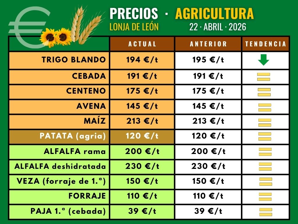 El trigo baja 21 euro el trigo (hasta 194 euros/t), la cebada repite a 191 euros/t, el maíz a 230 euros/t, el centeno a 175 y la avena a 145 euros/t.