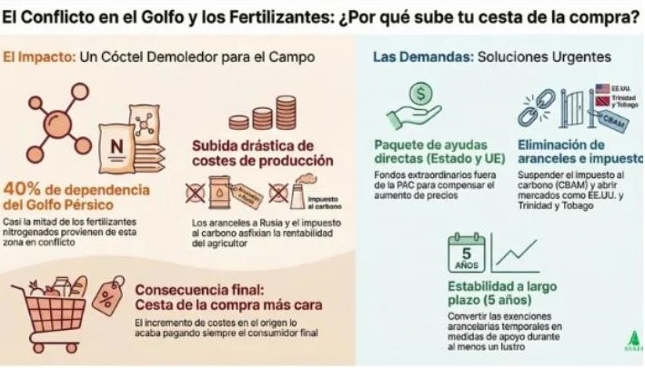 Por último, la organización pide a la Comisión Europea y al Gobierno de España que rectifiquen en la aplicación del impuesto al carbono a los fertilizantes importados, ya que esta medida encarecería aún más los costes de producción.