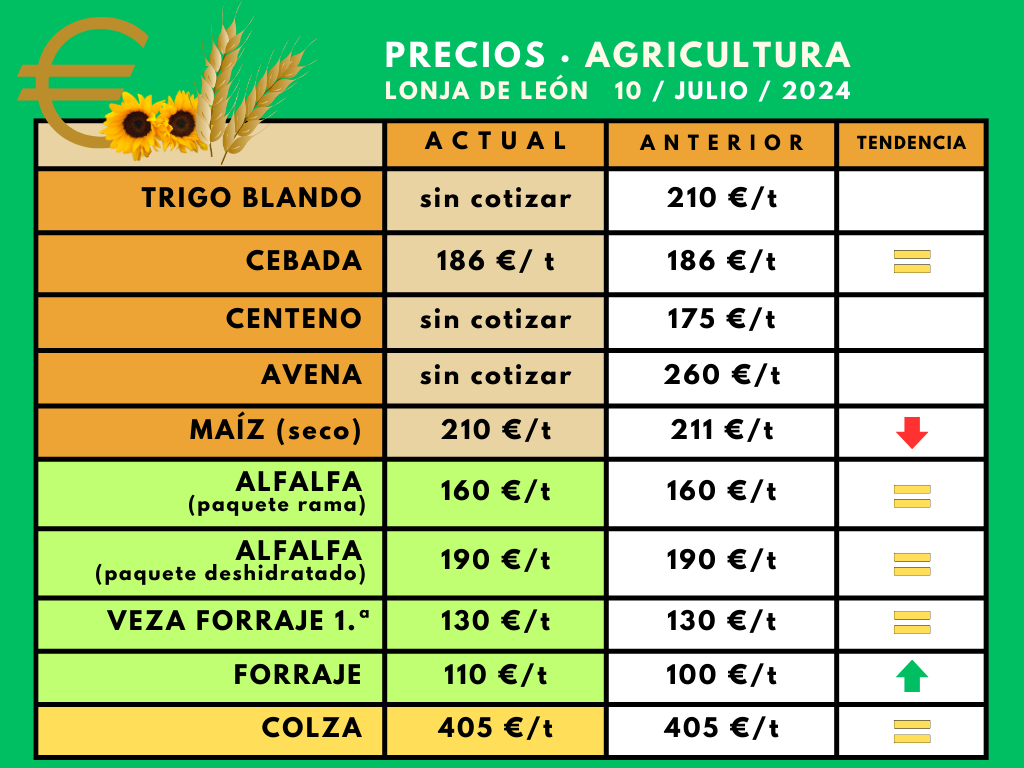 Con excepción de la cebada, los primeros precios de los cereales de invierno de la Lonja de León se están haciendo esperar, en ausencia aún de suficientes contratos de referencia con la nueva cosecha. Este miércoles, 10 de julio, siguieron sin dar cotización el trigo, la avena y el centeno, mientras la tonelada de cebada repitió en los 186 euros, cereal del que se han sembrado en la provincia de Palencia algo más de 98 000 hectáreas, el segundo cereal en superficie después del trigo, con cerca de 121 000 hectáreas.